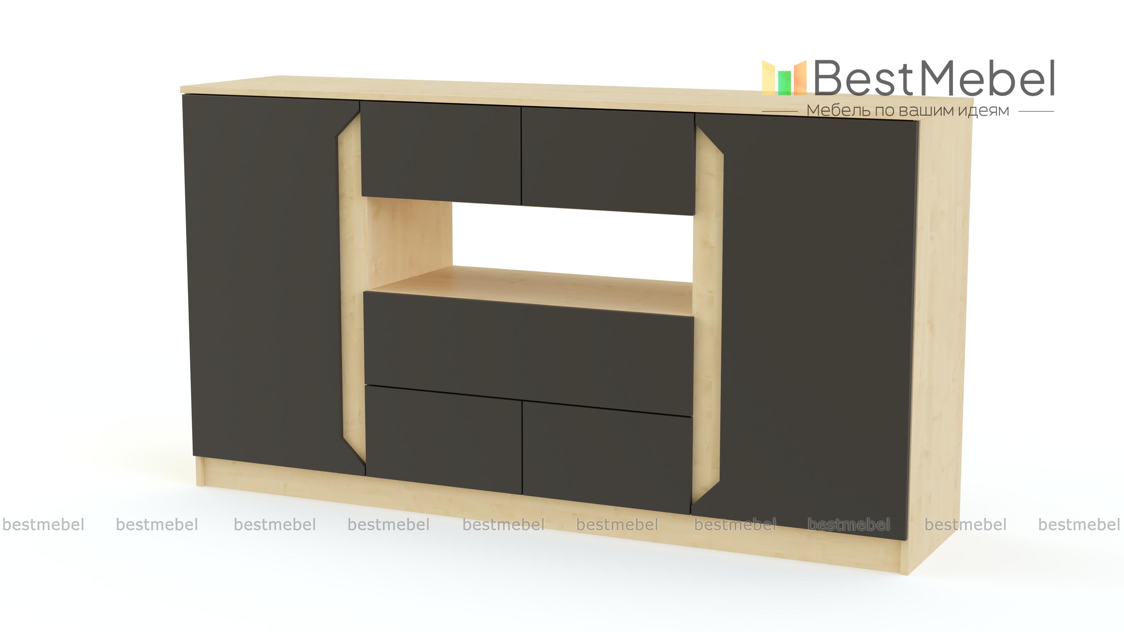 Крупногабаритная вместительная модель Виго 10 BMS не смотрится громоздкой за счет матовых фасадов и полностью открытой полки. Комод оснащен пятью разноразмерными выдвижными ящиками без ручек и двумя распашными отделениями с оригинальными декоративными вырезами. Такая вещь позволит обеспечить аккуратное хранение постельному белью, предметам гардероба, аксессуарам, книгам и прочим важным мелочам. Удобство и стильная расцветка делают комод отличным выбором для современной спальни или гостиной.