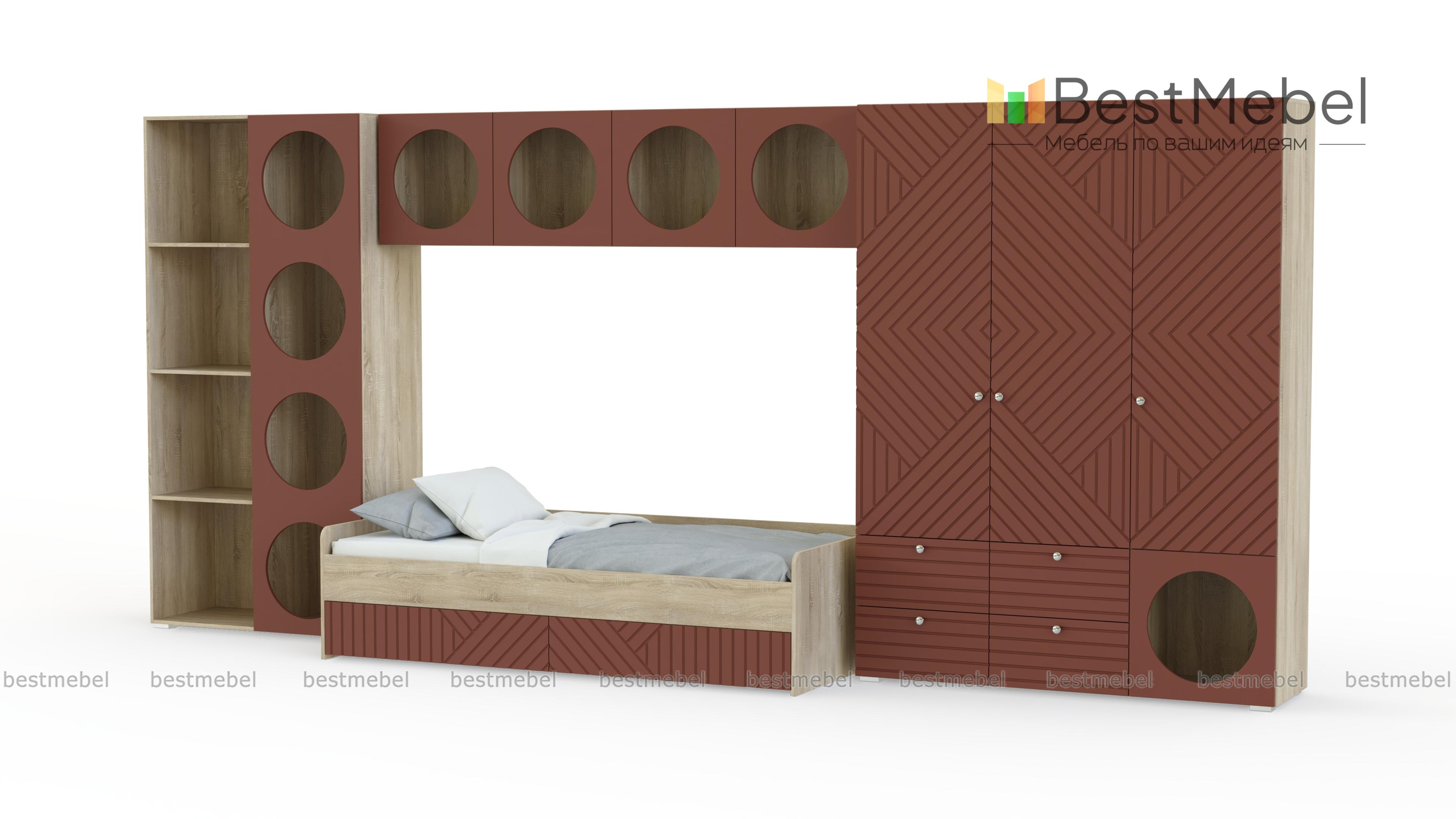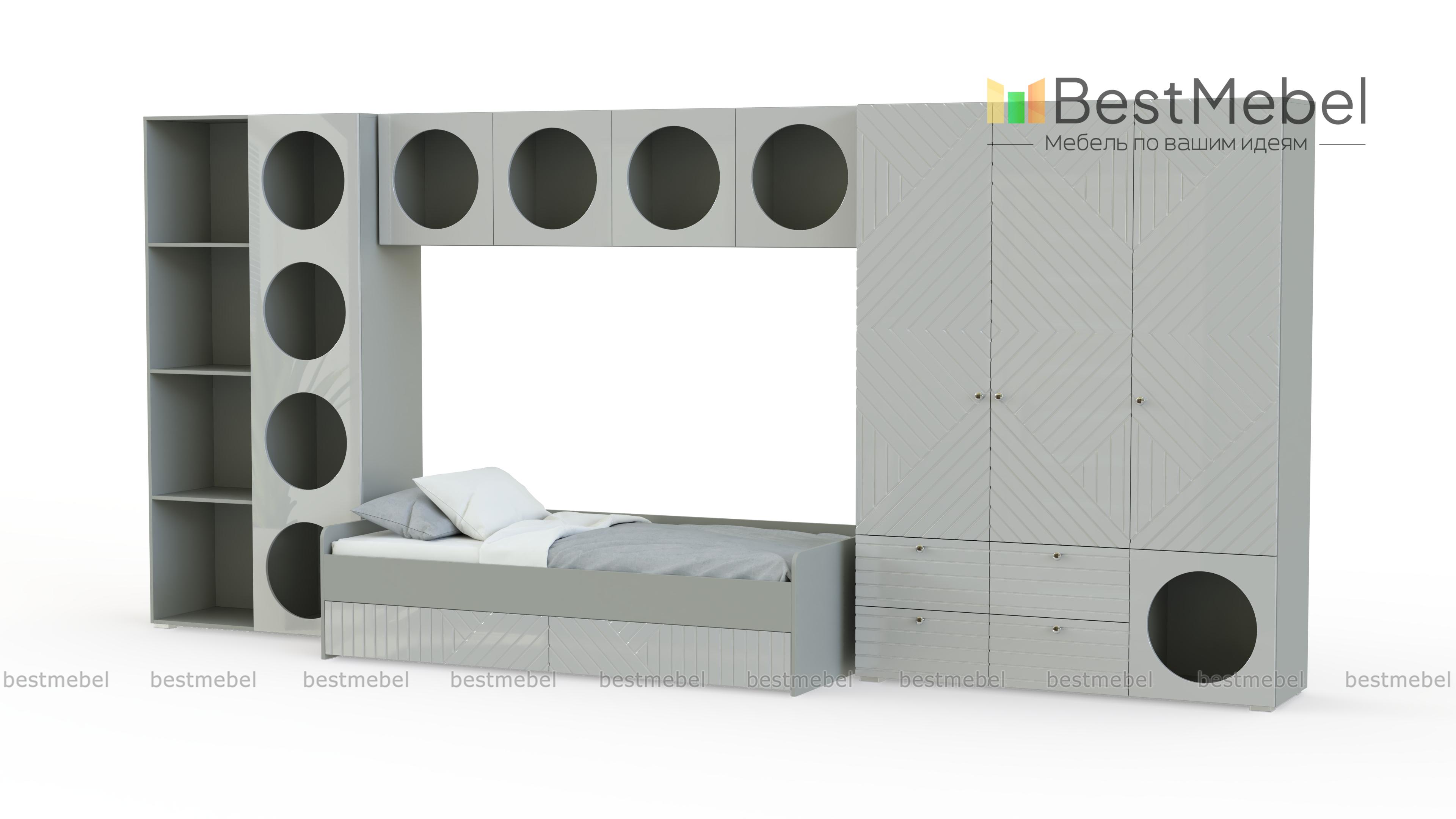 Детская комната Авелин 8 BMS позволит спланировать пространство с зонами отдыха и хранения. В основании кровати имеются выкатные ящики, большой трехдверный шкаф разместит всю одежду ребенка, а для игрушек и книг прекрасно подходят открытые секции полок и стеллажа. Геометрическая фрезеровка и круглые отсеки - основа узнаваемого современного дизайна. Купить детскую комнату Авелин 8 BMS в индивидуально подобранном размере и цвете вы сможете на сайте нашего интернет-магазина.