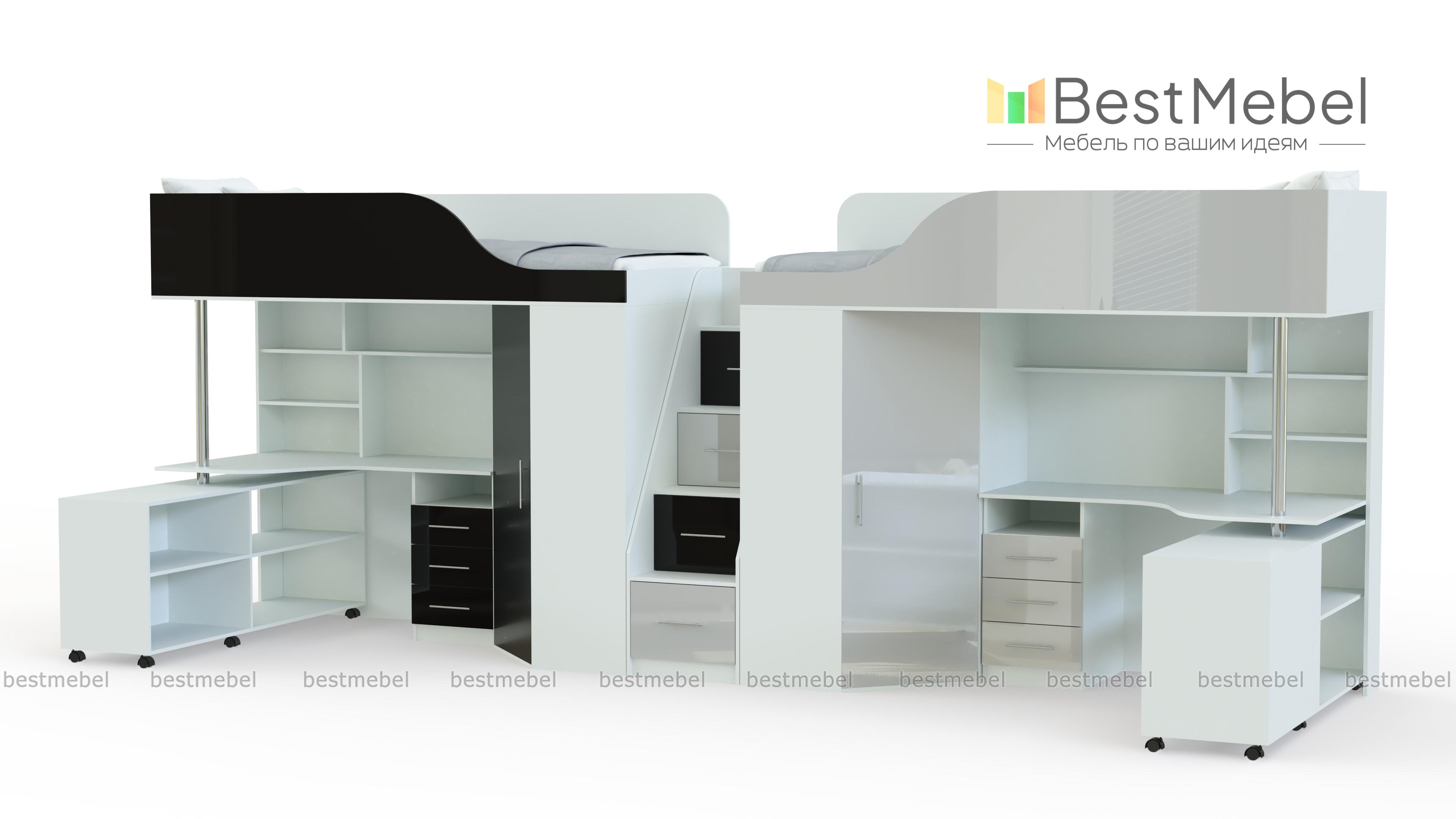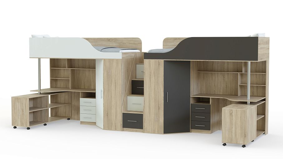 Кровать-чердак с рабочей зоной Мираж 17 BMS поможет вам рационально организовать пространство и обустроить комфортную современную детскую. Линейная композиция включает в себя два комфортных спальных места, расположенных на втором ярусе, лестницу-комод, распашные шкафы для одежды и рабочие места со столиками, книжными полками и тумбами для мелочей. Контрастные матовые фасады гармонично дополнят интерьер комнаты подростков. Купить кровать-чердак с рабочей зоной Мираж 17 BMS приглашаем в наш интернет-магазин.