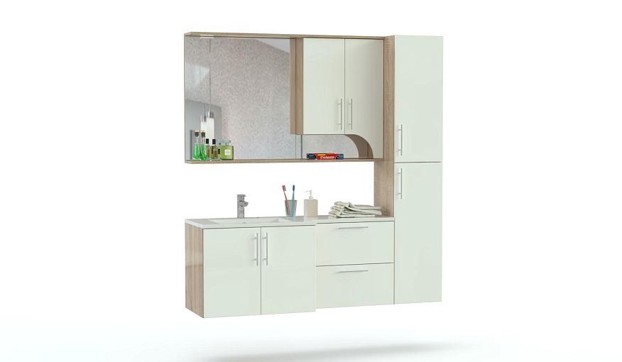 Комплект для ванной комнаты Пирс 2 BMS отличается ярким минималистичным дизайном, сочетая в оформлении белый и древесные оттенки с хромированной фурнитурой. Подвесная композиция объединила двухдверную распашную тумбу под раковину, тумбу с выдвижными ящиками, пенал и широкое зеркальное полотно, дополненное полочкой для мелочей и шкафом с фигурно вырезанным фасадом. Благодаря влагостойким поверхностям предметы надолго сохранят эстетичный вид. Купить комплект для ванной комнаты Пирс 2 BMS вы сможете на сайте нашего интернет-магазина.