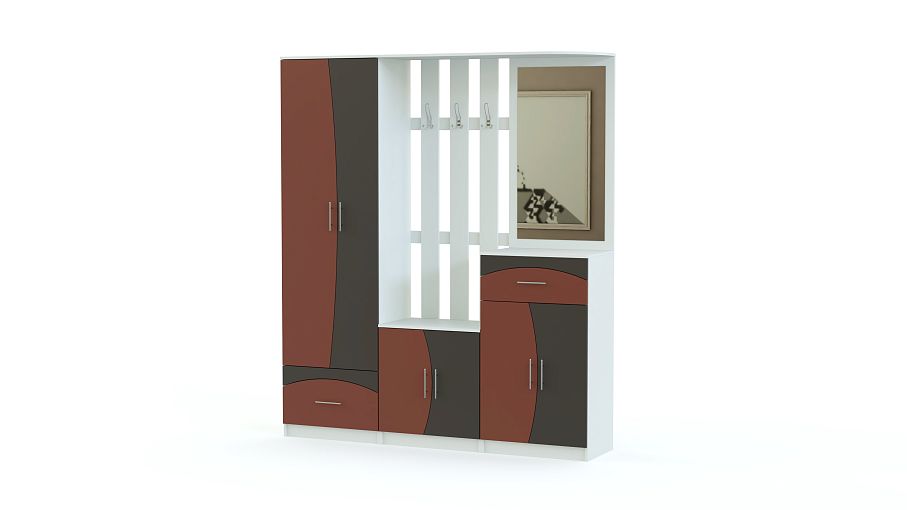 Стенка-прихожая «Идеал 28» BMS – комплект футуристичного дизайна, оригинальную расцветку которого непременно оценят поклонники современных интерьеров. Вместительность модели обеспечивают распашной шкаф, секция с тумбой и открытой вешалкой и высокая тумба, совмещенная с зеркалом. Необычно стилевое решение матовых фасадов – геометрический яркий рисунок на фоне светлого корпуса. Купить стенку-прихожую «Идеал 28» BMS по лучшей цене вы всегда сможете в нашем интернет-магазине.