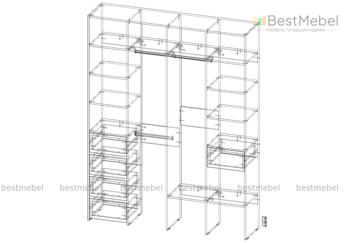 Гардеробная Страйп 4.1 поможет вам создать полноценную гардеробную, где у каждой вещи есть свое место. Продуманная компоновка позволяет развесить одежду по типам и сезонности, разместить обувные коробки и убрать мелочи. Три штанги, полки и выдвижные ящики находятся на удобной для ежедневного пользования высоте, учитывая требования эргономики. Купить Гардеробная Страйп 4.1 вы сможете в нашем интернет-магазине BestMebelShop!