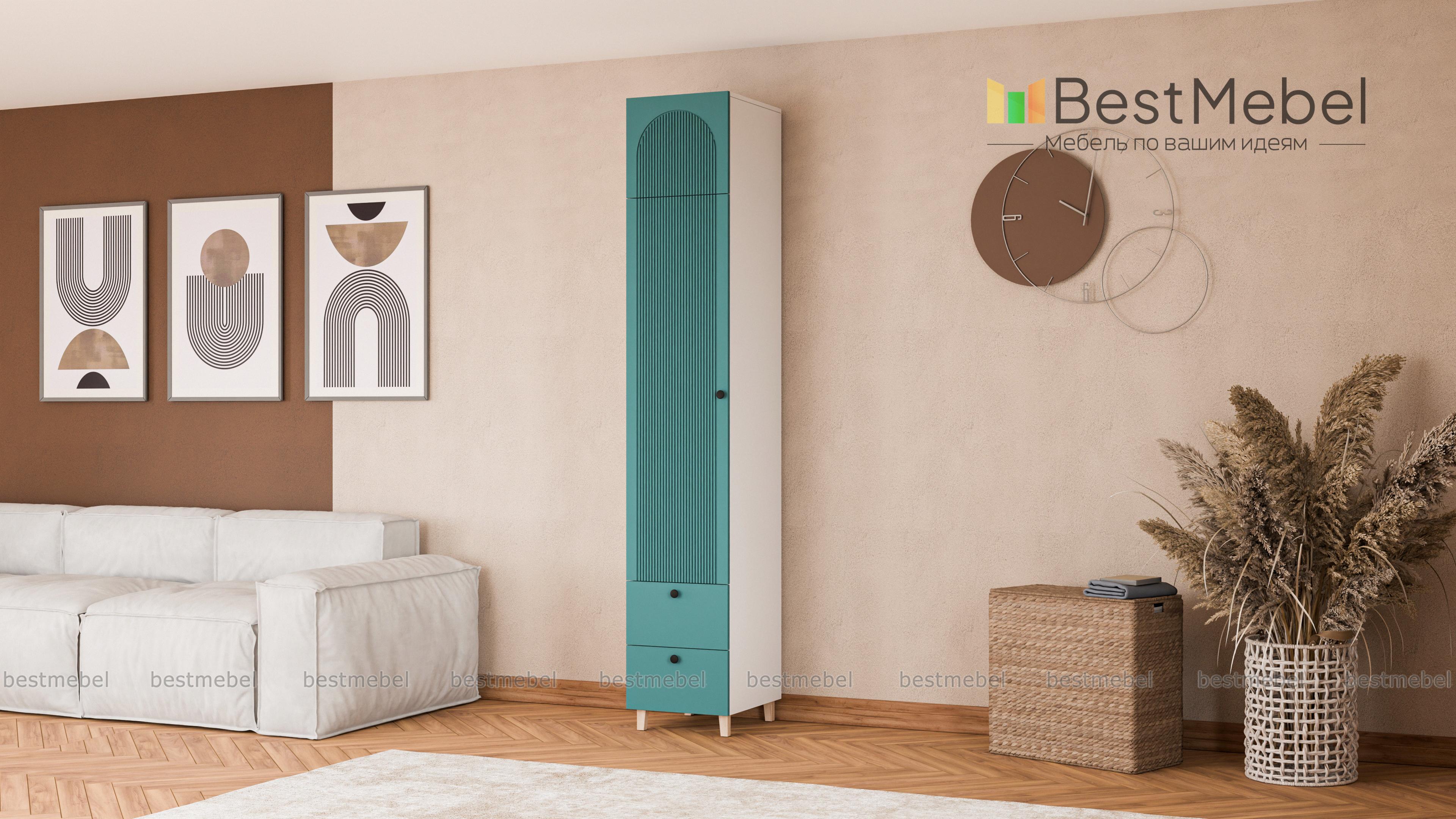 Шкаф-пенал Рене 14 BMS предлагает для хранения не только стандартное распашное отделение, но и два выдвижных ящика снизу, а также антресоль. Продуманная комплектация позволяет легко поддерживать порядок в вещах, а размеры пенала оптимальны для комнат малого метража. Для стильного вида — темный рифленый фасад с круглыми ручками и высокие опоры оттенка светлого дерева. Купить шкаф-пенал Рене 14 BMS, изготовленный по вашим размерам, приглашаем на сайт нашего интернет-магазина.