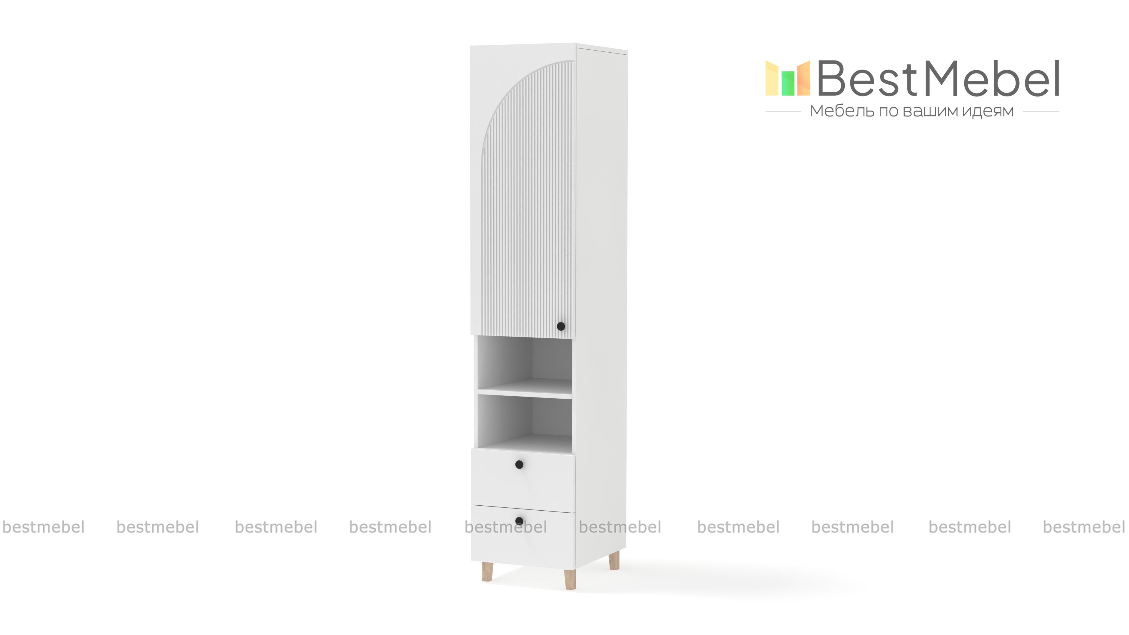 Шкаф-пенал Вивьен 5 BMS — небольшой и функциональный, отлично смотрится и в детской, и в гостиной. Древесного оттенка корпус с высокими ножками, изготовленный из ЛДСП, дополняет стильный фактурный фасад. Для удобного хранения конструкцией предусмотрены вместительное распашное отделение, ниша с полкой и два выдвижных ящика, расположенных снизу. Купить шкаф-пенал Вивьен 5 BMS с выбором размеров, цвета и фурнитуры вы сможете на сайте нашего интернет-магазина.