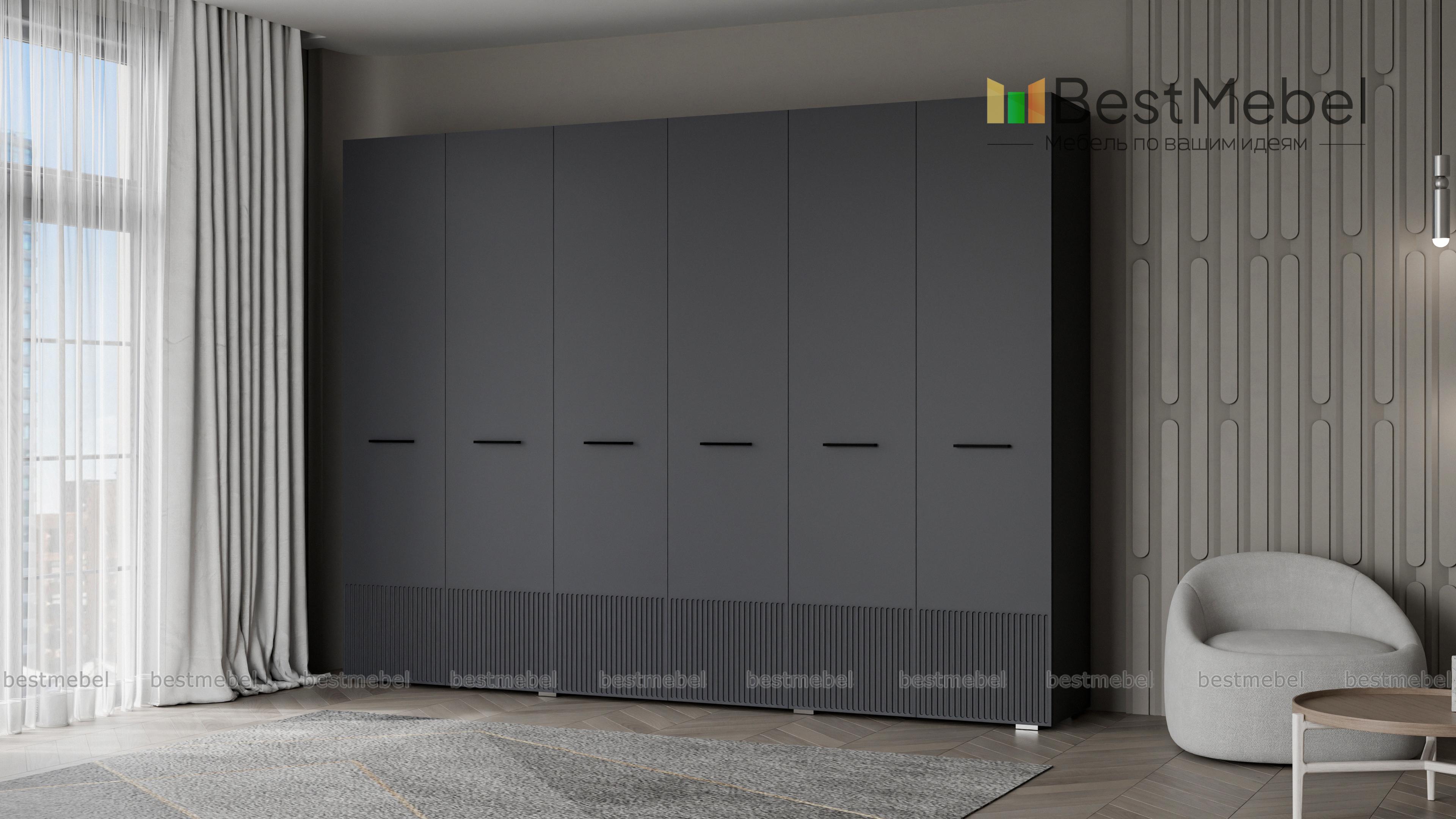 Шкаф распашной Декарт 6 BMS с шестью дверцами создан для хранения в просторных комнатах и обладает отличной вместительностью. Габариты шкафа скрадывает светлый оттенок, фрезеровка в нижней части фасада — практичное и стильное решение. Порядок в вашем гардеробе помогут легко поддерживать две центральные штанги и вместительные бельевые полки по бокам. Купить шкаф распашной Декарт 6 BMS, изготовленный по вашим размерам, приглашаем на сайт нашего интернет-магазина.