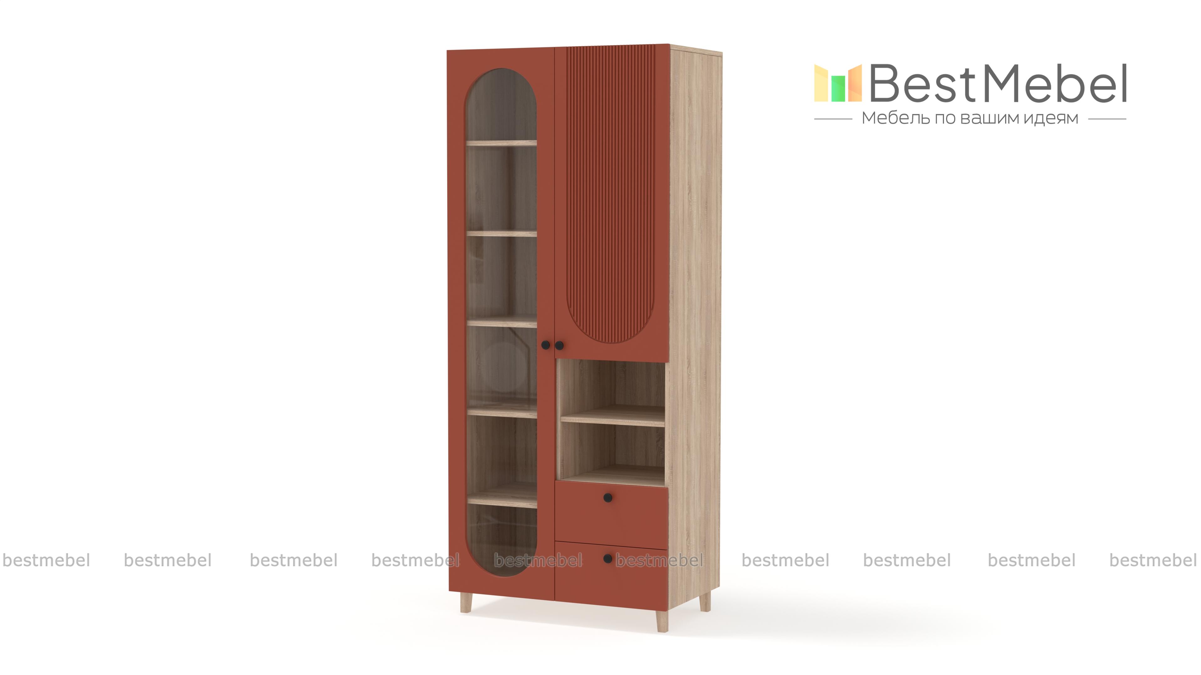 Шкаф распашной Рене 6 BMS с фактурным фасадом органично вписывается в пространство современной квартиры. Лаконичный силуэт с высокими ножками сочетается с оригинальным геометричным декором. Овальный вырез витрины слева дополняет закрытое отделение справа, секция с полкой для открытого хранения и два вместительных выдвижных ящика под мелкие вещи. Купить шкаф распашной Рене 6 BMS вы сможете в нашем интернет-магазине, подобрав размеры, цвет и фурнитуру.