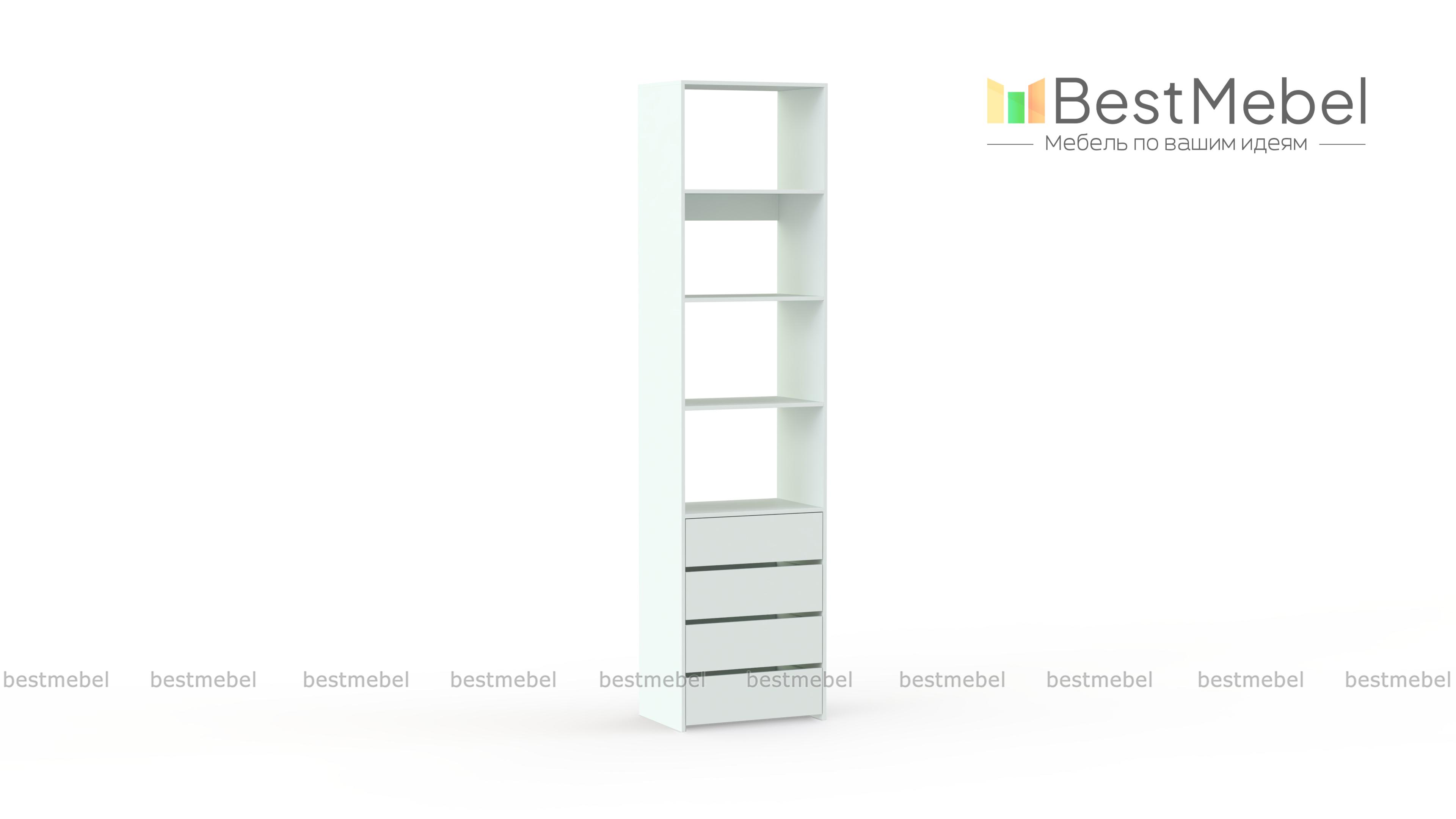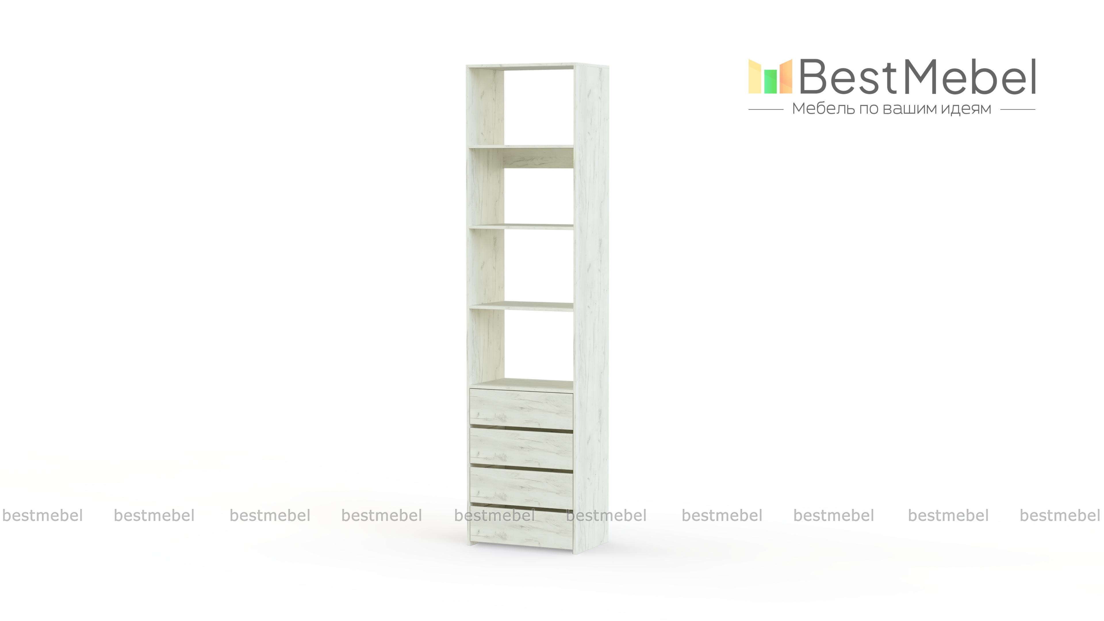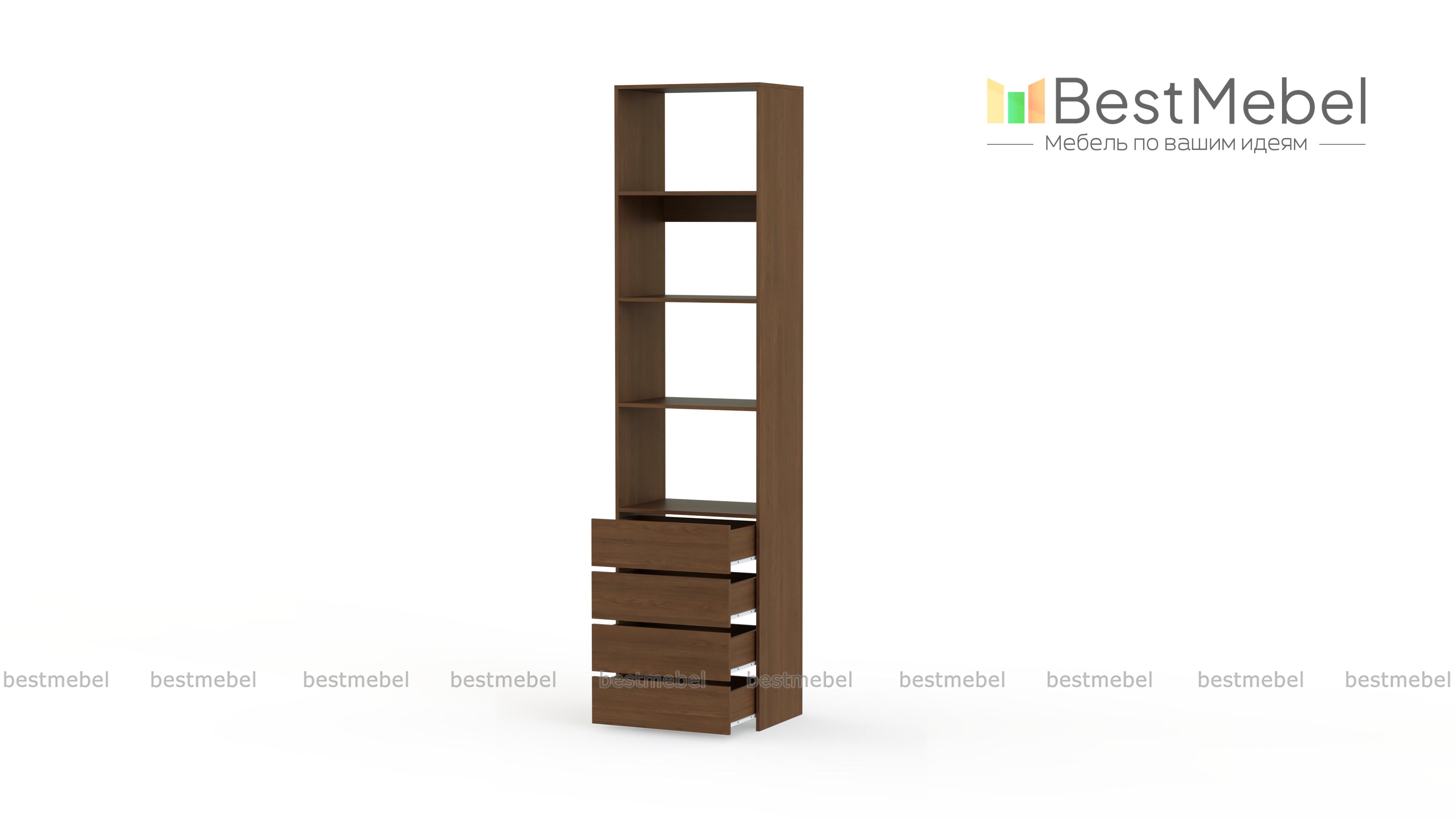 Стеллаж для одежды Мирта 35 BMS может дополнить другие стеллажи серии или использоваться самостоятельно. Три бельевые полки сверху дополнены четырьмя выдвижными ящиками для трикотажа, аксессуаров и прочих мелких вещей. Узкий стеллаж легко вписывается в ниши, маленькие спальни, прихожие или гардеробные, решая проблему ограниченного пространства. Купить стеллаж для одежды Мирта 35 BMS приглашаем в наш интернет-магазин в любом размере и оттенке из каталога.