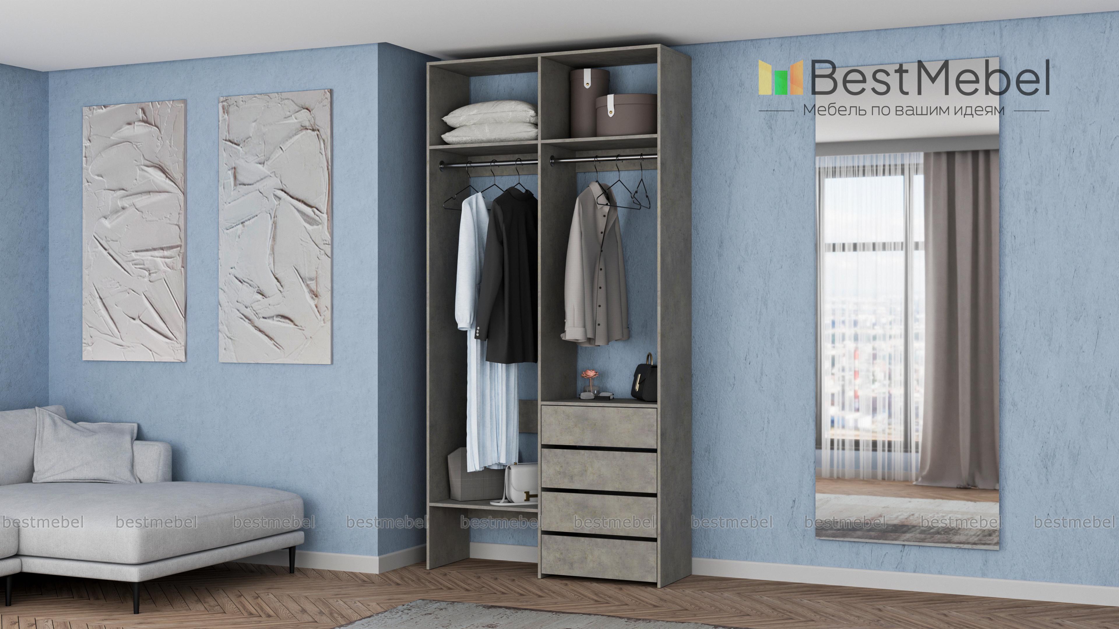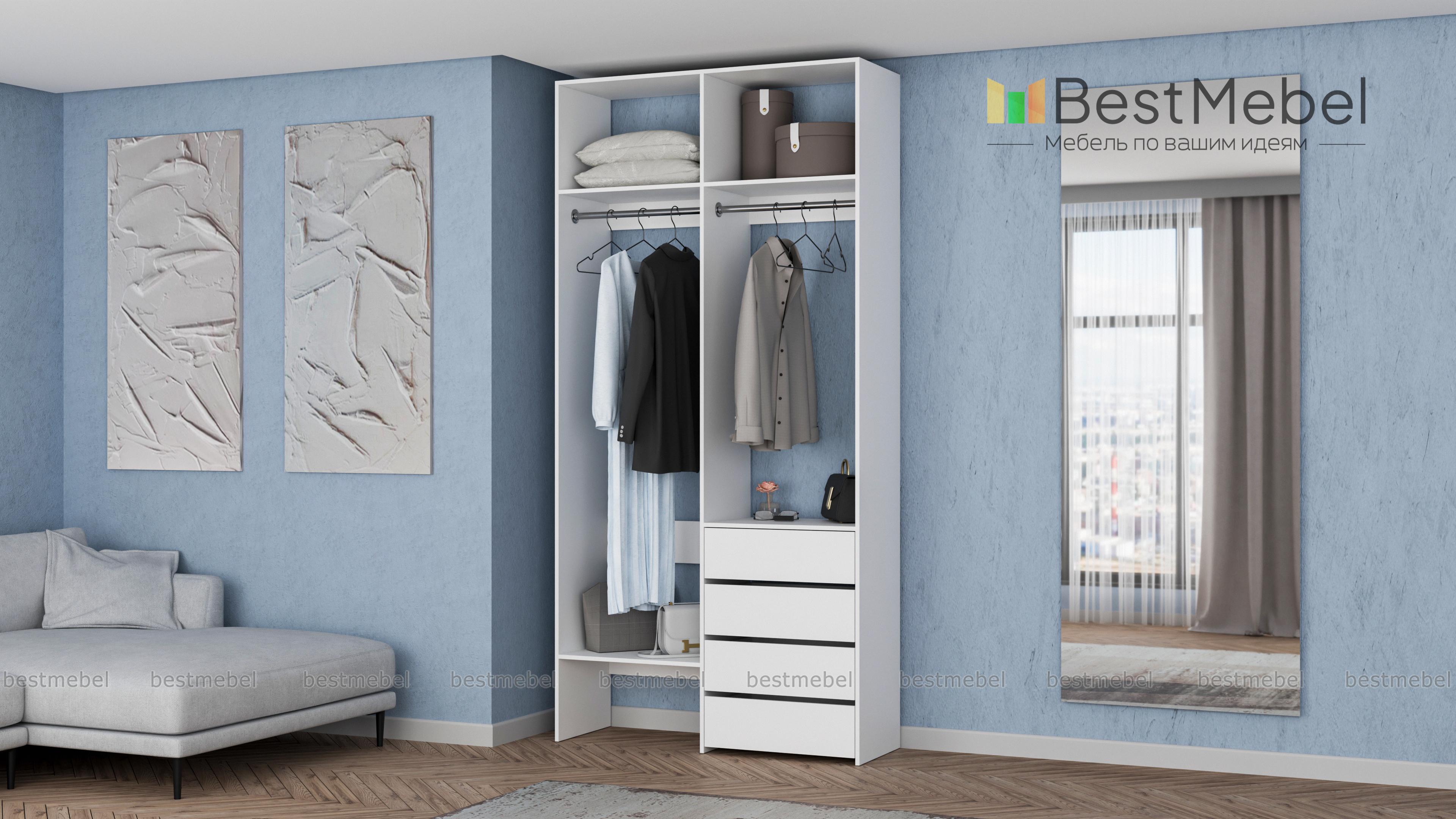 Стеллаж для одежды Мирта 45 BMS позволяет выделить зоны для хранения разных вещей. Комплектация включает в себя отделения со штангами для короткой и длинной одежды, полки сверху и снизу, а также ряд из четырех выдвижных ящиков справа. Двухсекционный стеллаж выполнен в светлом базовом оттенке и отлично смотрится на небольшом метраже. Купить стеллаж для одежды Мирта 45 BMS вы всегда сможете в нашем интернет-магазине, подобрав нужные размеры и оттенок по каталогу.