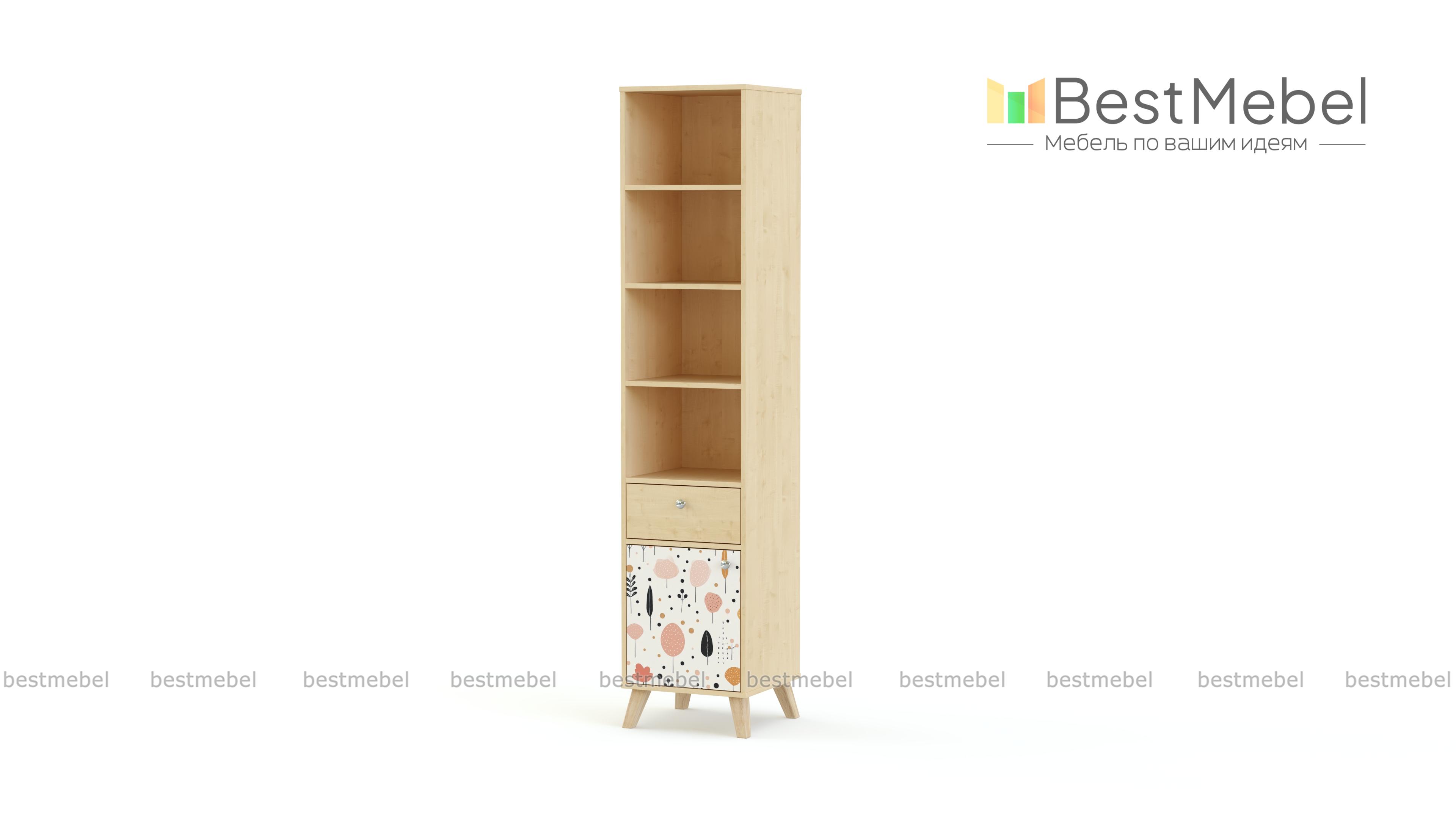 Стеллаж Эльза 5 BMS поможет в обустройстве рабочей или игровой зоны в детской. Модель со скошенными деревянными ножками оборудована тремя полками для книг и игрушек, выдвижным ящиком для мелочей и нижним отделением с распашной дверцей. Для отделки корпуса и фасада выбраны нейтральные светлые оттенки, эргономичная фурнитура и стильный рисунок-фотопечать. Купить стеллаж Эльза 5 BMS, изготовленный по вашим размерам, вы сможете на сайте нашего интернет-магазина.