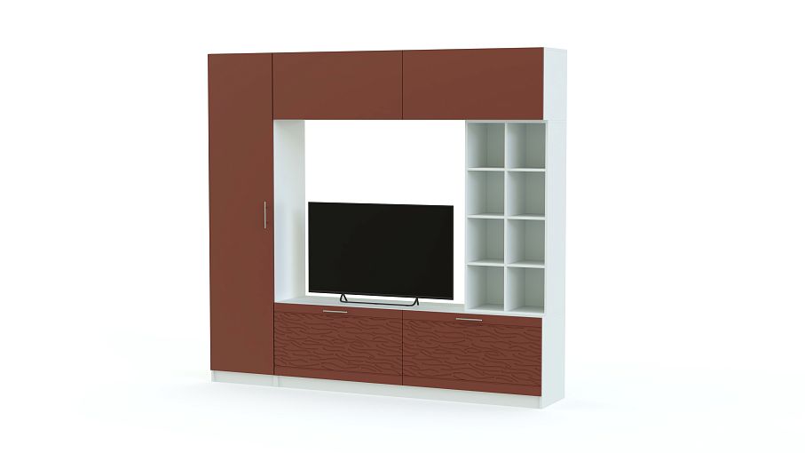 Стенка-горка Вельвет 3 Глянец BMS из популярной серии современных моделей с 3D рисунком порадует владельцев ярким дизайном и вместительностью. Расположенные по периметру бельевая колонка, низкая широкая тумба, стеллаж и антресоль с откидными дверцами позволят эффектно разместить в центральной нише ТВ. Компактная стенка сэкономит полезную площадь, а контрастные терракотовые фасады добавят помещению необходимый объем. Купить стенку-горку Вельвет 3 Глянец BMS по доступной цене приглашаем в наш интернет-магазин.