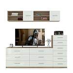Стенка Лили 95 BMS поможет вам обустроить комфортную зону отдыха, разместив аппаратуру, сопутствующие аксессуары, книги и предметы декора. Модульный мини-комплект включает в себя широкую низкую тумбу под ТВ, комод с шестью выдвижными ящиками и навесную полку с глухими и открытыми отделениями. Корпус древесного оттенка дополняют белые глянцевые фасады с ручками-рейлингами. Купить стенку Лили 95 BMS для современной гостиной приглашаем в наш интернет-магазин.