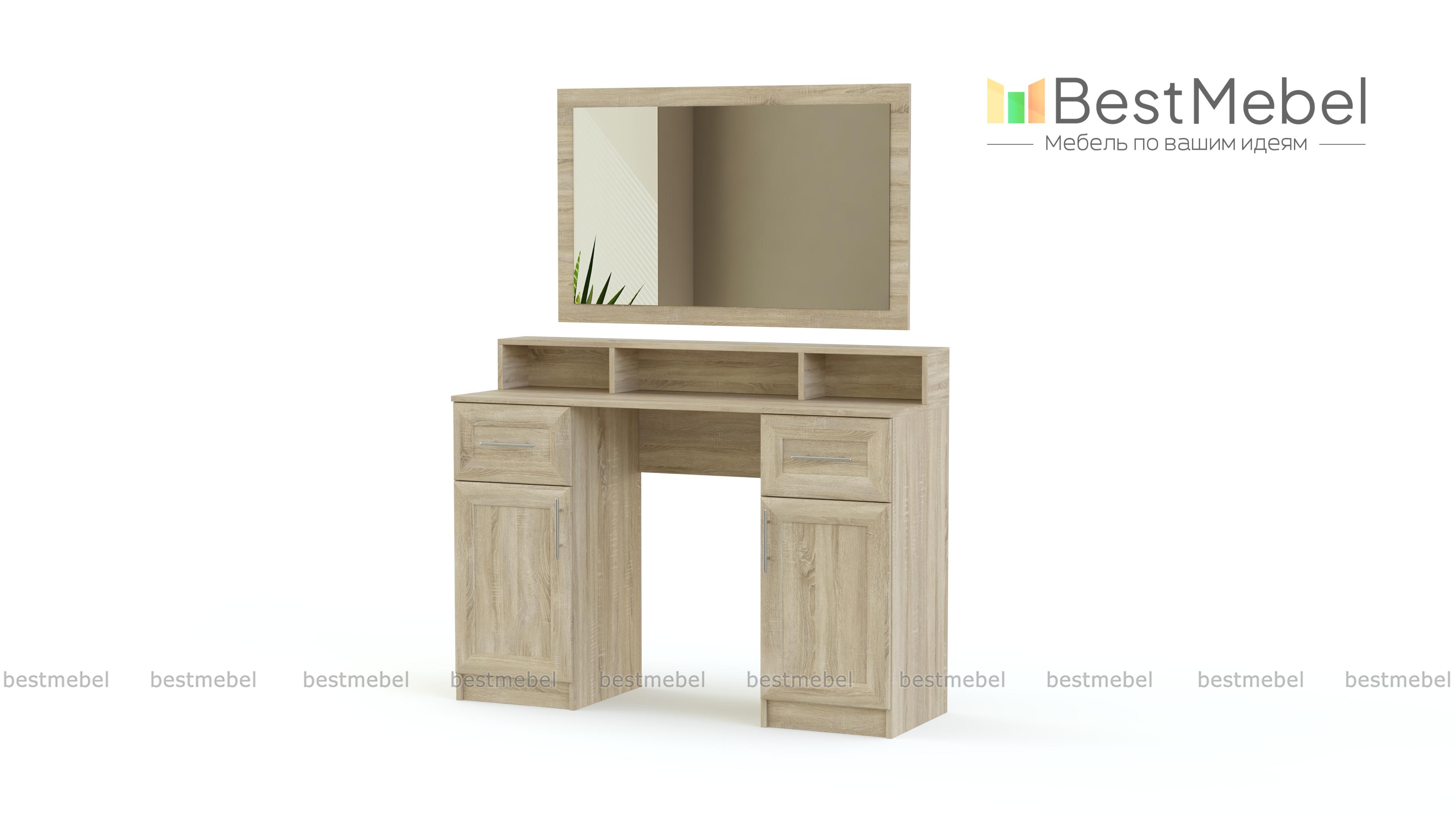 Туалетный столик Милена 9 BMS легко дополнит интерьер уютной и практичной спальни в классическом стиле. Тёплые цвета фасадов с имитацией текстуры дерева создают расслабляющую атмосферу в помещении, а хромированные ручки-рейлинги гармонично выделяются на распашных дверцах и ящиках. Широкое зеркало станет незаменимым помощником при нанесении макияжа или уходе за кожей лица и волосами. Вместительные тумбы и широкая столешница с открытой полкой разместят все необходимое.
